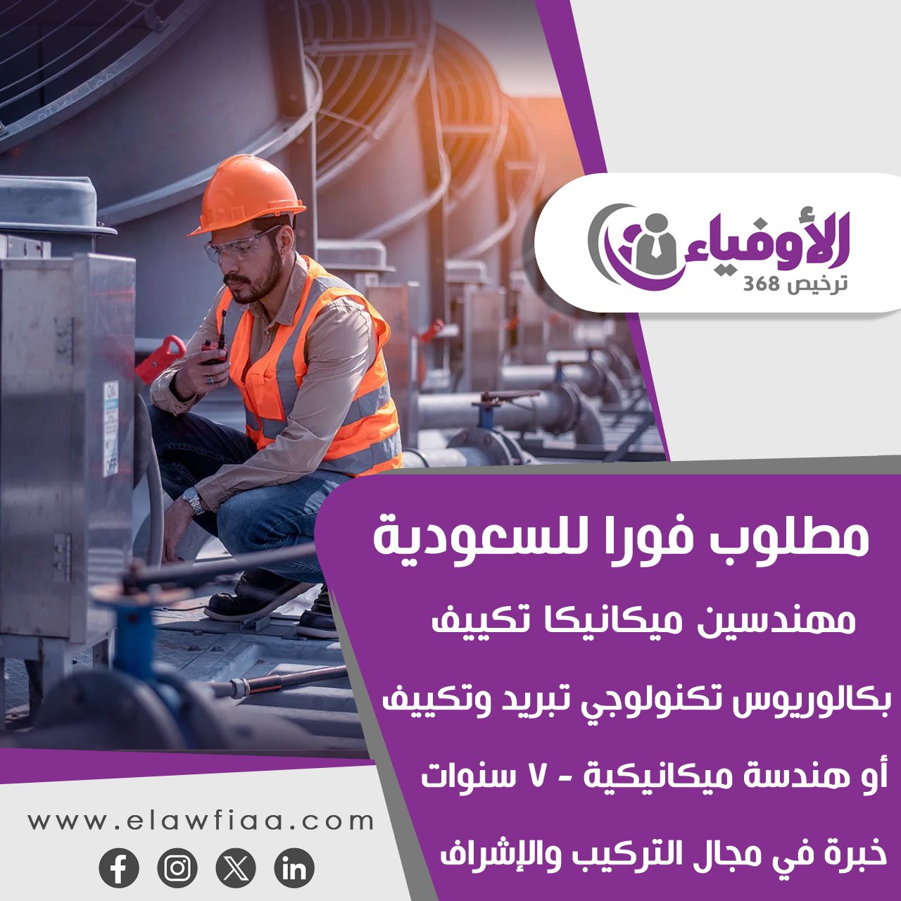 مطلوب فورا للسعودية لشركة كبري في مجال التكييف والأعمال الكهروميكانيكية علي مستوي المملكة..